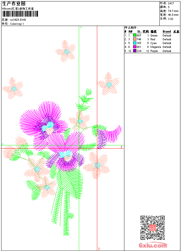 - emb花版参数: 大小:34.50 KB / 尺寸:46*75[毫米] / 针数:2417针 / 线色:5 / 格式:emb / 版本:9