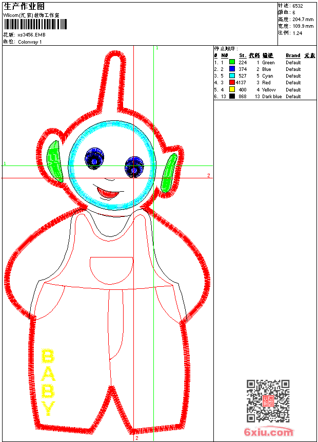 - emb花版参数: 大小:47.50 KB / 尺寸:110*205[毫米] / 针数:6530针 / 线色:6 / 格式:emb / 版本:9