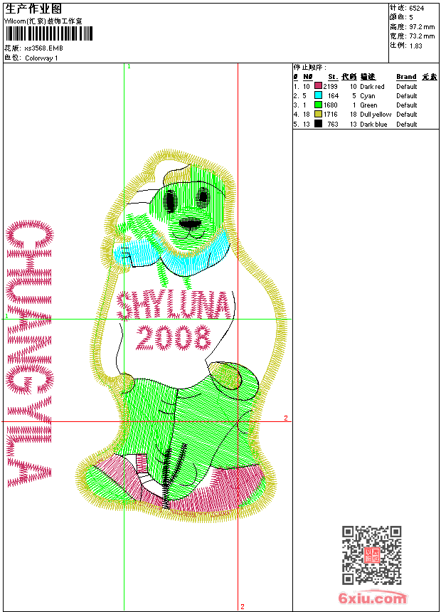 - emb花版参数: 大小:55.00 KB / 尺寸:73*97[毫米] / 针数:6526针 / 线色:5 / 格式:emb / 版本:9