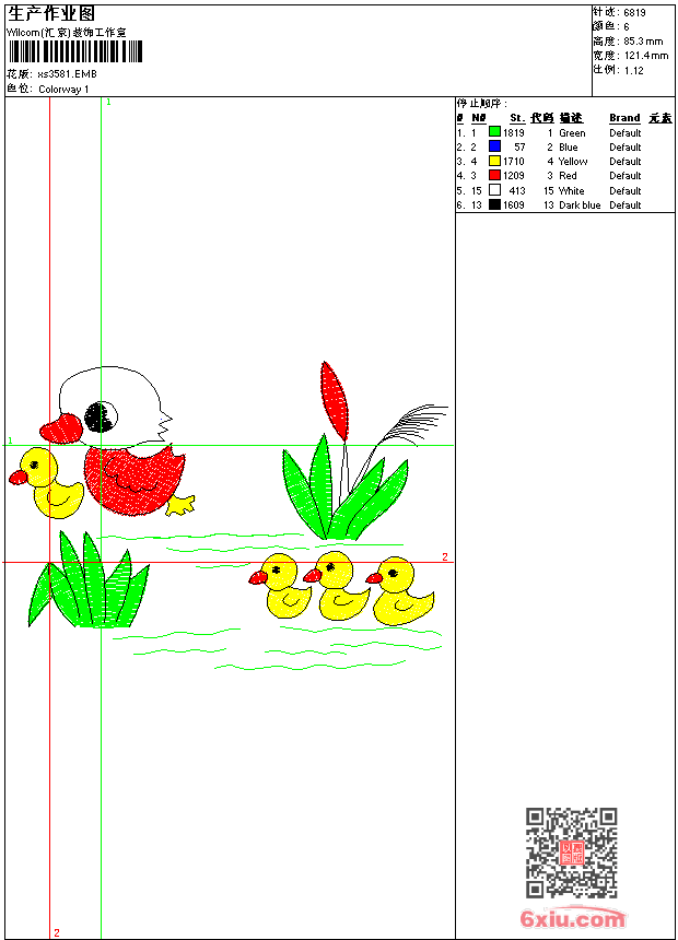 - emb花版参数: 大小:52.00 KB / 尺寸:121*85[毫米] / 针数:6819针 / 线色:6 / 格式:emb / 版本:9