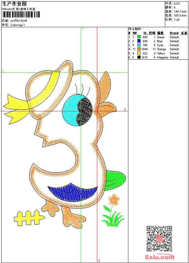 - emb花版参数: 大小:52.00 KB / 尺寸:106*145[毫米] / 针数:6127针 / 线色:6 / 格式:emb / 版本:9