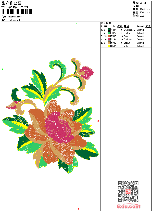- emb花版参数: 大小:112.50 KB / 尺寸:134*160[毫米] / 针数:26151针 / 线色:6 / 格式:emb / 版本:9