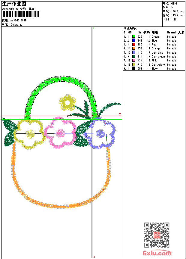- emb花版参数: 大小:53.00 KB / 尺寸:114*127[毫米] / 针数:4991针 / 线色:9 / 格式:emb / 版本:9