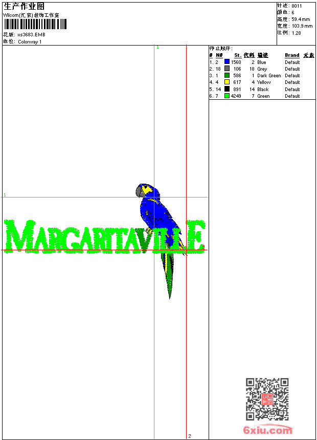 - emb花版参数: 大小:60.50 KB / 尺寸:104*59[毫米] / 针数:8011针 / 线色:6 / 格式:emb / 版本:9