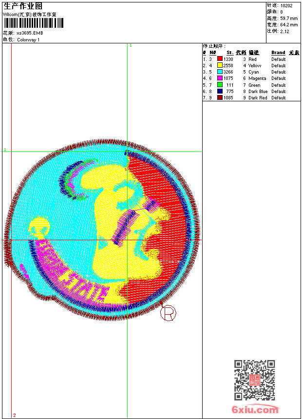 - emb花版参数: 大小:55.50 KB / 尺寸:64*60[毫米] / 针数:10202针 / 线色:8 / 格式:emb / 版本:9