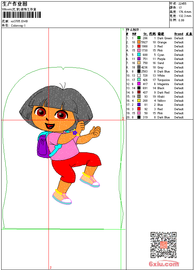 - emb花版参数: 大小:112.50 KB / 尺寸:132*176[毫米] / 针数:22455针 / 线色:17 / 格式:emb / 版本:9