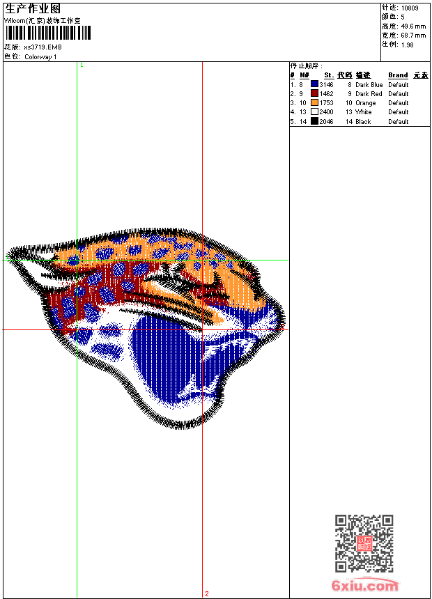 - emb花版参数: 大小:71.50 KB / 尺寸:69*50[毫米] / 针数:10809针 / 线色:5 / 格式:emb / 版本:9