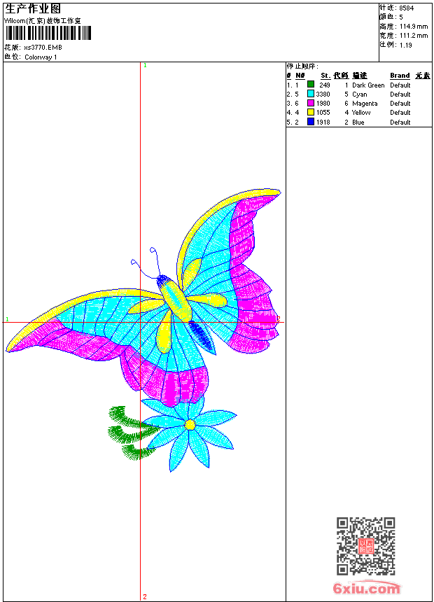 - emb花版参数: 大小:58.50 KB / 尺寸:111*115[毫米] / 针数:8583针 / 线色:5 / 格式:emb / 版本:9