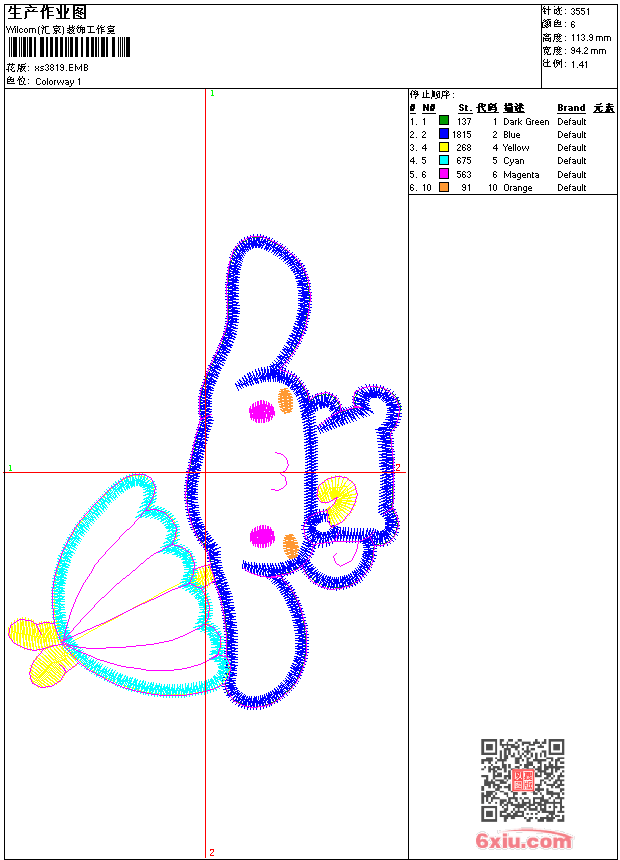- emb花版参数: 大小:53.50 KB / 尺寸:94*114[毫米] / 针数:3552针 / 线色:6 / 格式:emb / 版本:9