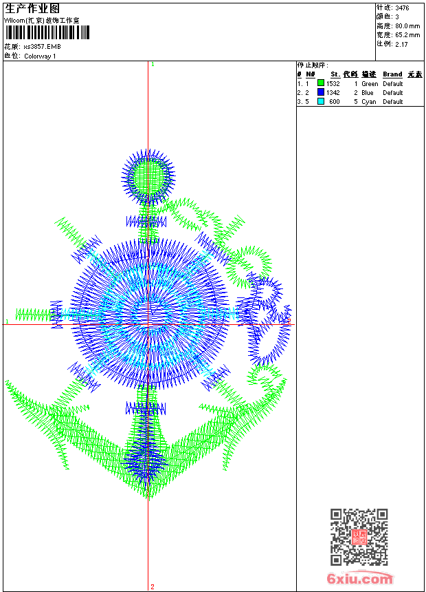 - emb花版参数: 大小:39.50 KB / 尺寸:65*80[毫米] / 针数:3476针 / 线色:3 / 格式:emb / 版本:9