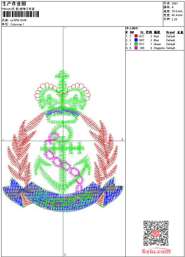 - emb花版参数: 大小:44.00 KB / 尺寸:60*71[毫米] / 针数:3891针 / 线色:4 / 格式:emb / 版本:9
