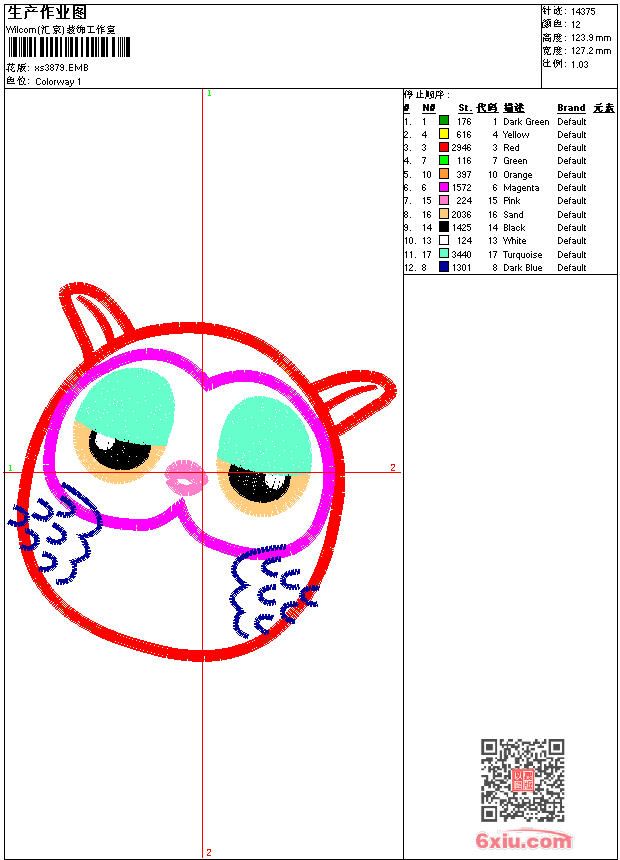 - emb花版参数: 大小:95.00 KB / 尺寸:127*124[毫米] / 针数:14375针 / 线色:12 / 格式:emb / 版本:9