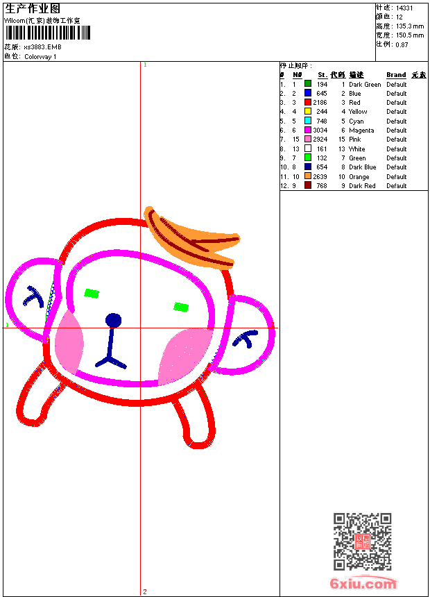 - emb花版参数: 大小:88.50 KB / 尺寸:151*182[毫米] / 针数:14367针 / 线色:12 / 格式:emb / 版本:9