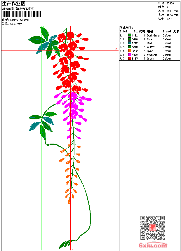 - emb花版参数: 大小:133.00 KB / 尺寸:158*553[毫米] / 针数:25470针 / 线色:7 / 格式:emb / 版本:9