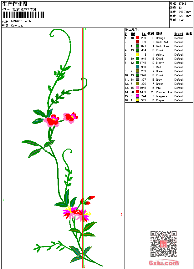 - emb花版参数: 大小:109.50 KB / 尺寸:222*647[毫米] / 针数:17666针 / 线色:13 / 格式:emb / 版本:9