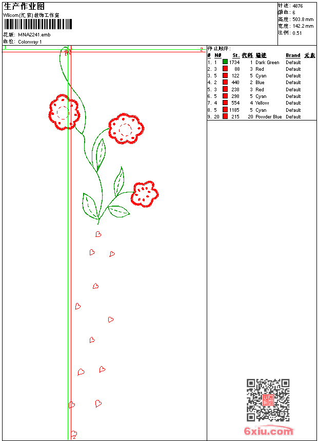 - emb花版参数: 大小:51.00 KB / 尺寸:142*504[毫米] / 针数:4876针 / 线色:6 / 格式:emb / 版本:9