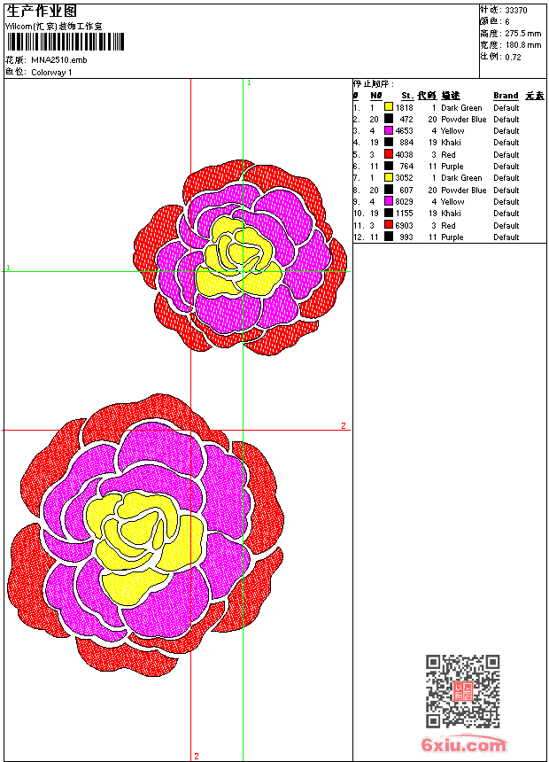 - emb花版参数: 大小:133.00 KB / 尺寸:181*276[毫米] / 针数:33370针 / 线色:6 / 格式:emb / 版本:9