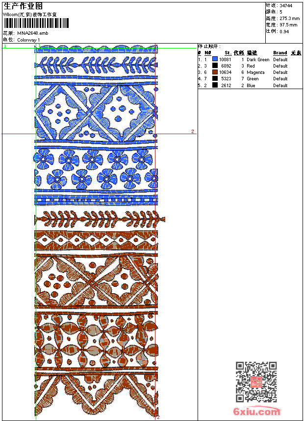 - emb花版参数: 大小:153.50 KB / 尺寸:97*275[毫米] / 针数:34744针 / 线色:5 / 格式:emb / 版本:9