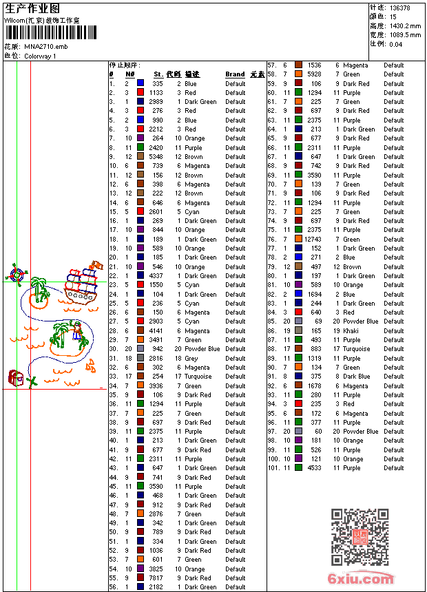 - emb花版参数: 大小:711.00 KB / 尺寸:1090*1430[毫米] / 针数:136378针 / 线色:15 / 格式:emb / 版本:9