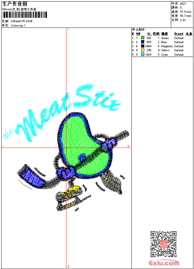 - emb花版参数: 大小:107.50 KB / 尺寸:57*58[毫米] / 针数:6021针 / 线色:5 / 格式:emb / 版本:9