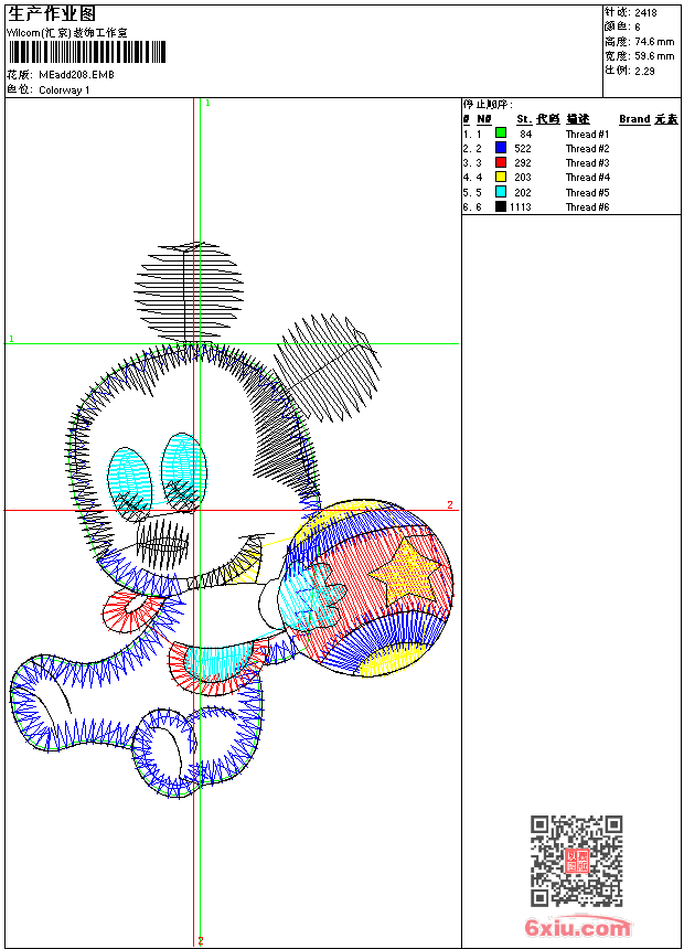 - emb花版参数: 大小:30.00 KB / 尺寸:60*75[毫米] / 针数:2418针 / 线色:6 / 格式:emb / 版本:9