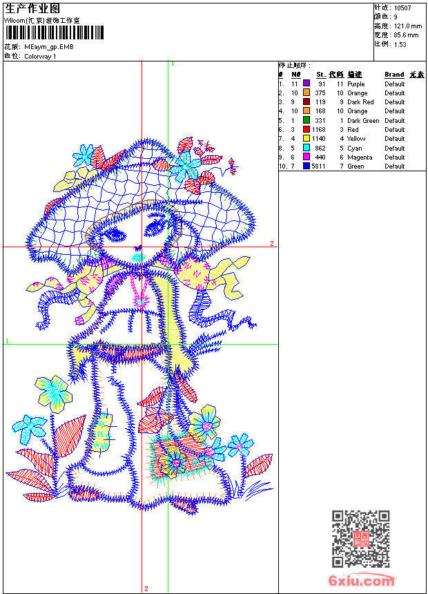- emb花版参数: 大小:160.50 KB / 尺寸:86*121[毫米] / 针数:10507针 / 线色:9 / 格式:emb / 版本:9