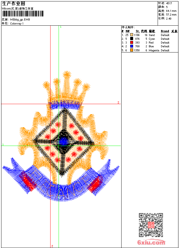 - emb花版参数: 大小:41.50 KB / 尺寸:57*64[毫米] / 针数:4517针 / 线色:5 / 格式:emb / 版本:9
