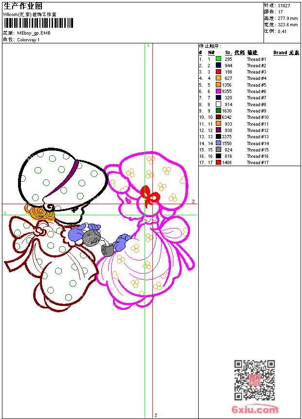 - emb花版参数: 大小:96.50 KB / 尺寸:324*278[毫米] / 针数:31827针 / 线色:17 / 格式:emb / 版本:9