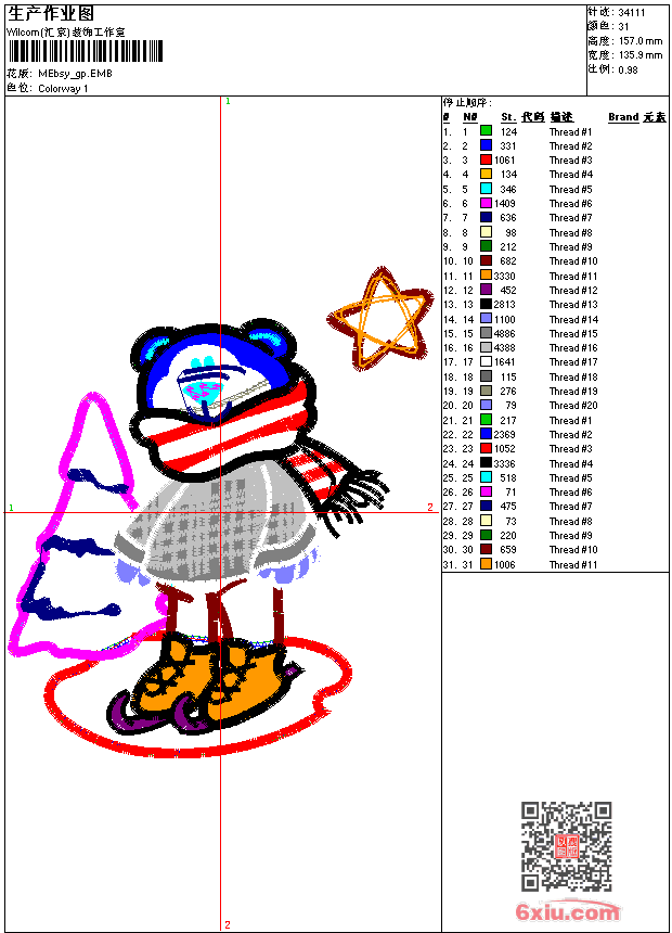 - emb花版参数: 大小:113.50 KB / 尺寸:136*157[毫米] / 针数:34111针 / 线色:31 / 格式:emb / 版本:9