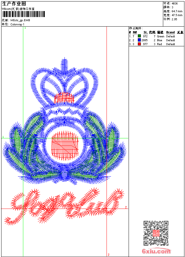 - emb花版参数: 大小:46.00 KB / 尺寸:48*65[毫米] / 针数:4836针 / 线色:3 / 格式:emb / 版本:9