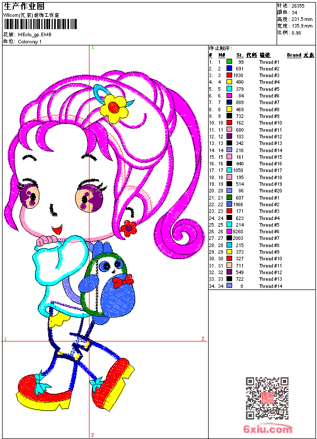 - emb花版参数: 大小:110.00 KB / 尺寸:136*232[毫米] / 针数:26355针 / 线色:34 / 格式:emb / 版本:9