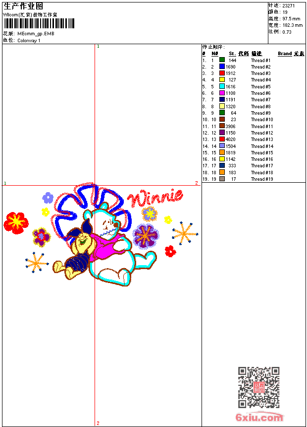 - emb花版参数: 大小:108.00 KB / 尺寸:182*98[毫米] / 针数:23271针 / 线色:19 / 格式:emb / 版本:9