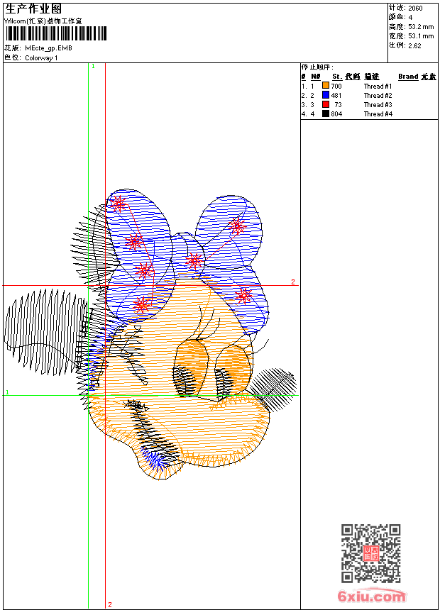 - emb花版参数: 大小:25.00 KB / 尺寸:53*53[毫米] / 针数:2060针 / 线色:4 / 格式:emb / 版本:9