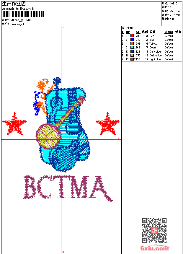 - emb花版参数: 大小:79.50 KB / 尺寸:71*76[毫米] / 针数:10915针 / 线色:7 / 格式:emb / 版本:9