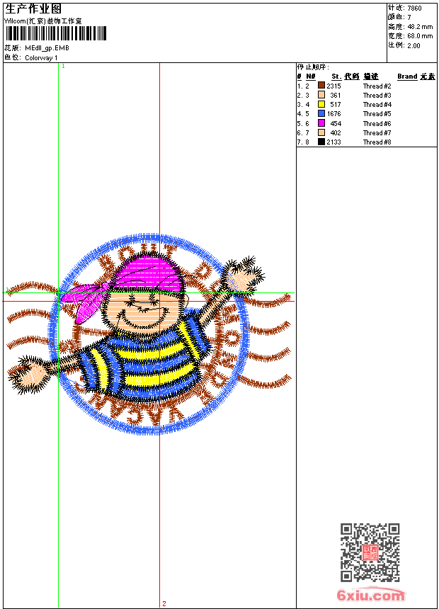 - emb花版参数: 大小:46.50 KB / 尺寸:68*48[毫米] / 针数:7860针 / 线色:7 / 格式:emb / 版本:9