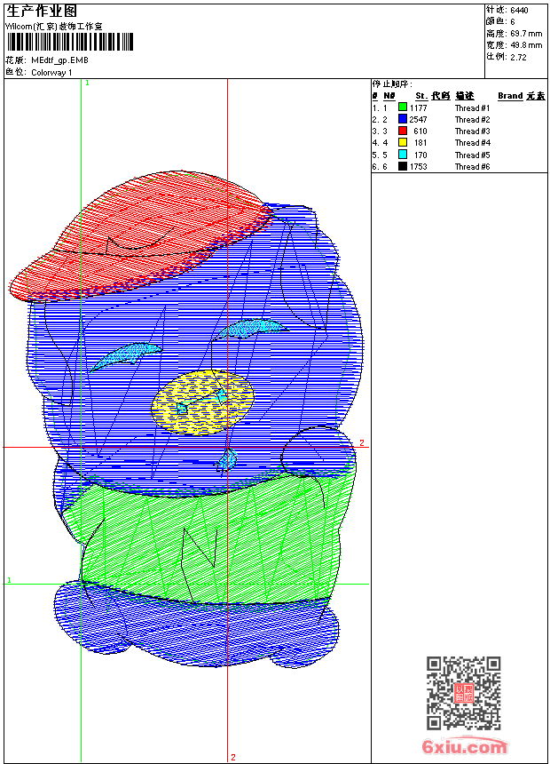 - emb花版参数: 大小:31.00 KB / 尺寸:50*70[毫米] / 针数:6440针 / 线色:6 / 格式:emb / 版本:9
