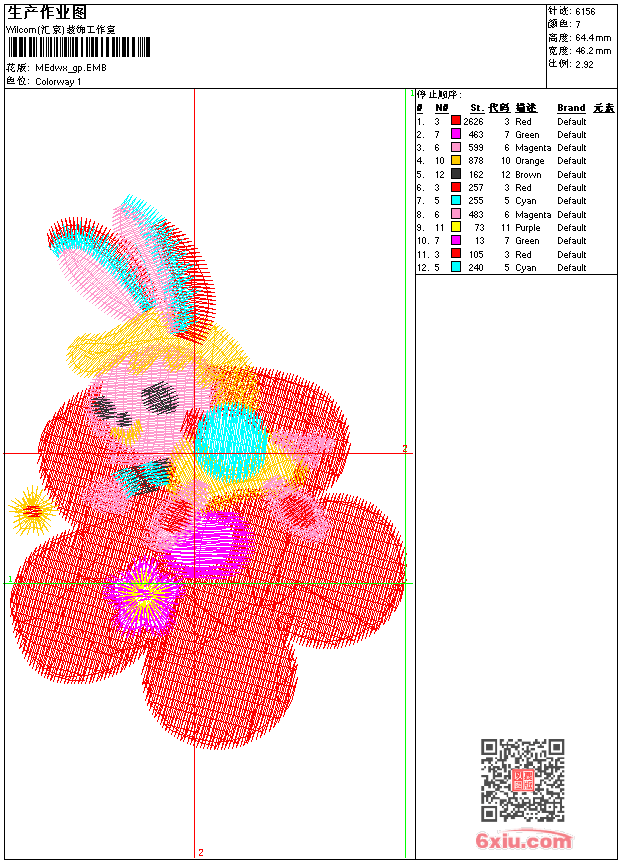 - emb花版参数: 大小:50.50 KB / 尺寸:46*64[毫米] / 针数:6156针 / 线色:7 / 格式:emb / 版本:9