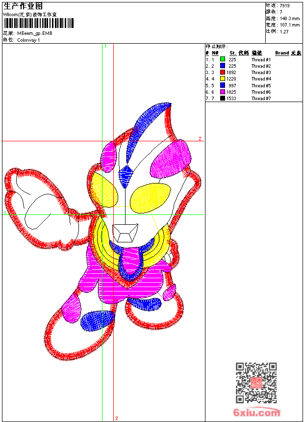 - emb花版参数: 大小:39.50 KB / 尺寸:107*140[毫米] / 针数:7919针 / 线色:7 / 格式:emb / 版本:9