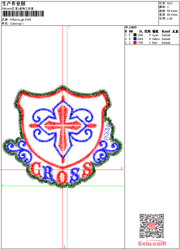 - emb花版参数: 大小:54.00 KB / 尺寸:68*59[毫米] / 针数:5231针 / 线色:3 / 格式:emb / 版本:9