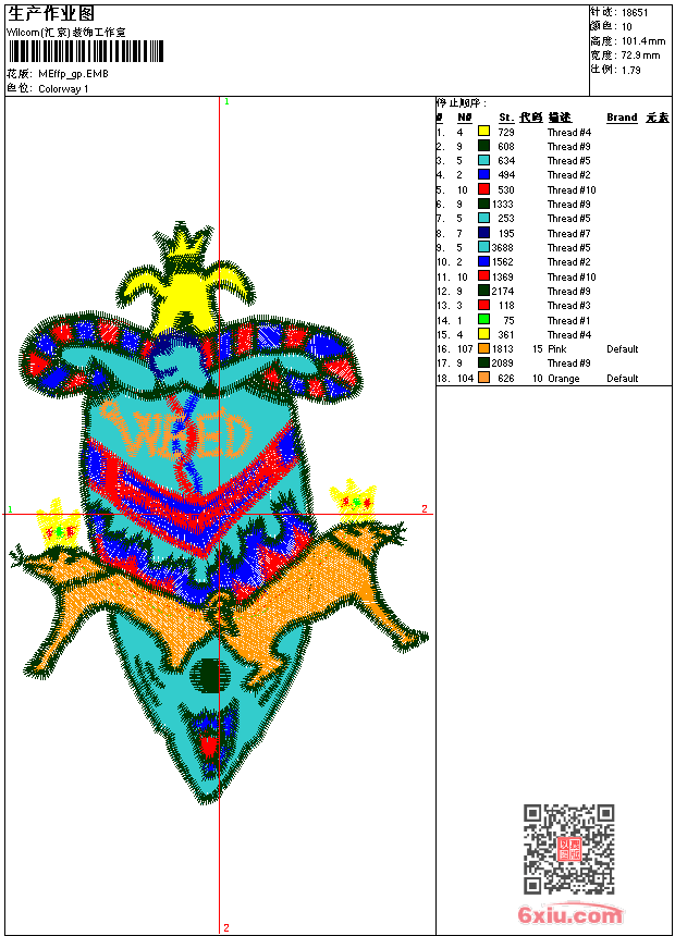 - emb花版参数: 大小:120.00 KB / 尺寸:73*101[毫米] / 针数:18651针 / 线色:10 / 格式:emb / 版本:9