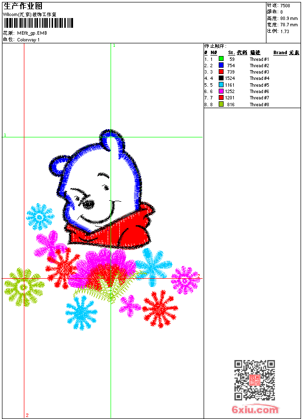 - emb花版参数: 大小:57.00 KB / 尺寸:79*81[毫米] / 针数:7508针 / 线色:8 / 格式:emb / 版本:9