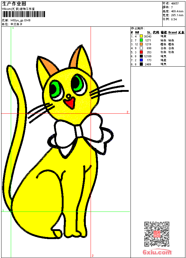 - emb花版参数: 大小:132.50 KB / 尺寸:265*409[毫米] / 针数:48657针 / 线色:7 / 格式:emb / 版本:9