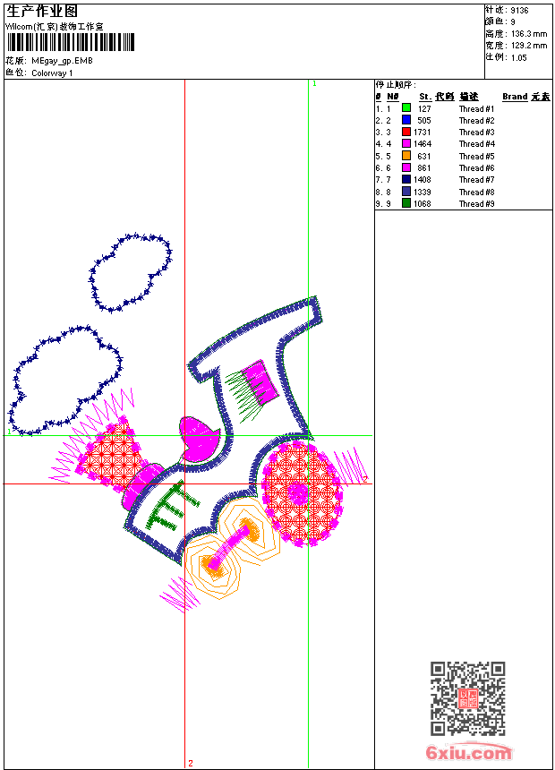 - emb花版参数: 大小:41.50 KB / 尺寸:129*136[毫米] / 针数:9136针 / 线色:9 / 格式:emb / 版本:9