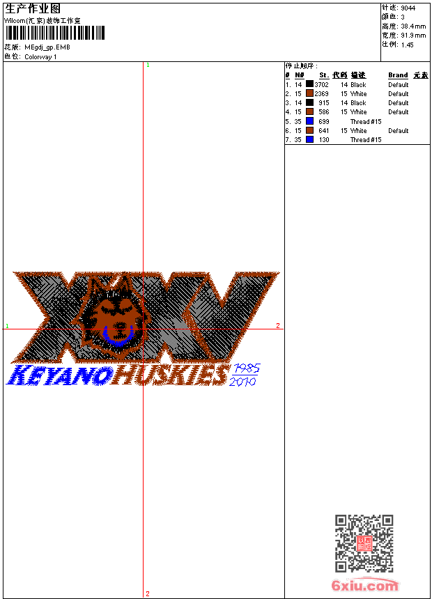 - emb花版参数: 大小:55.00 KB / 尺寸:92*38[毫米] / 针数:9044针 / 线色:3 / 格式:emb / 版本:9