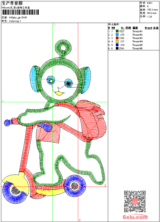 - emb花版参数: 大小:38.00 KB / 尺寸:99*155[毫米] / 针数:6431针 / 线色:6 / 格式:emb / 版本:9