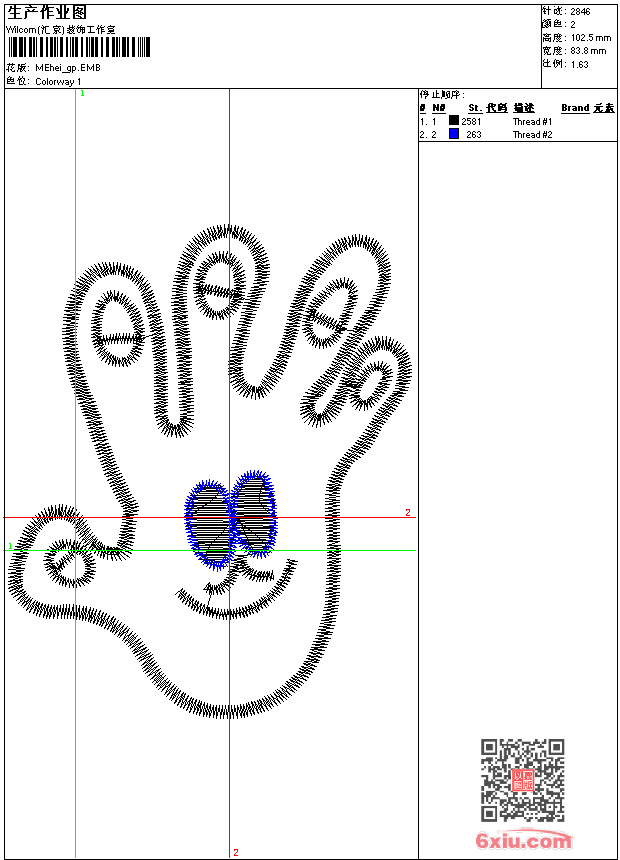 - emb花版参数: 大小:25.00 KB / 尺寸:84*103[毫米] / 针数:2846针 / 线色:2 / 格式:emb / 版本:9