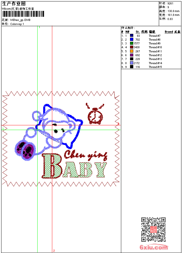 - emb花版参数: 大小:55.50 KB / 尺寸:162*131[毫米] / 针数:9261针 / 线色:9 / 格式:emb / 版本:9