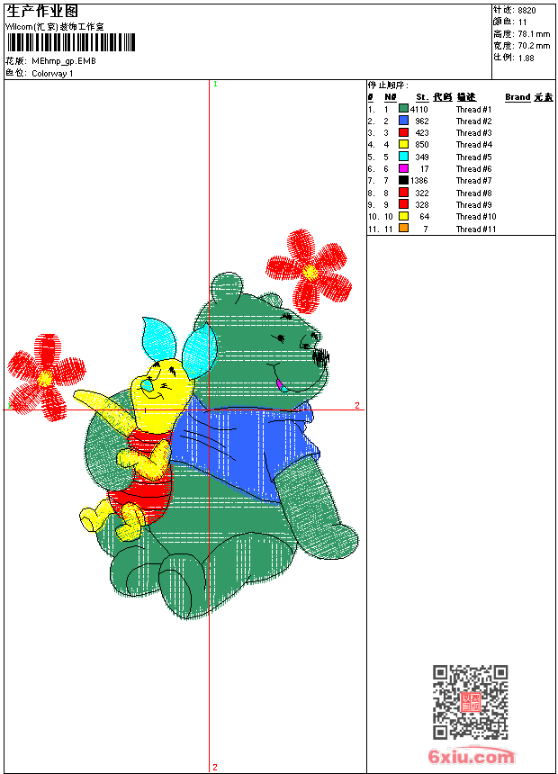 - emb花版参数: 大小:46.00 KB / 尺寸:70*78[毫米] / 针数:8820针 / 线色:11 / 格式:emb / 版本:9