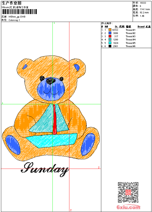 - emb花版参数: 大小:75.00 KB / 尺寸:92*114[毫米] / 针数:19333针 / 线色:6 / 格式:emb / 版本:9