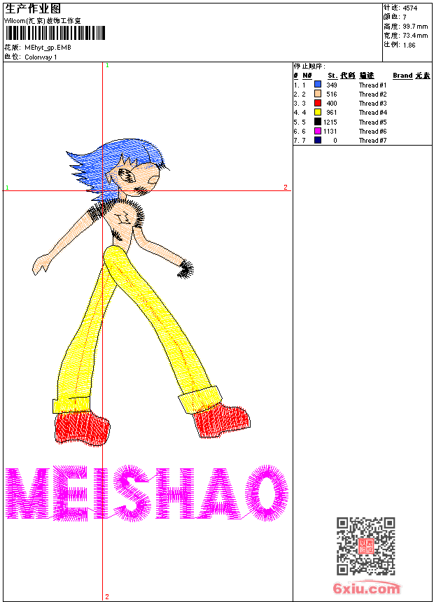 - emb花版参数: 大小:33.50 KB / 尺寸:73*100[毫米] / 针数:4574针 / 线色:7 / 格式:emb / 版本:9